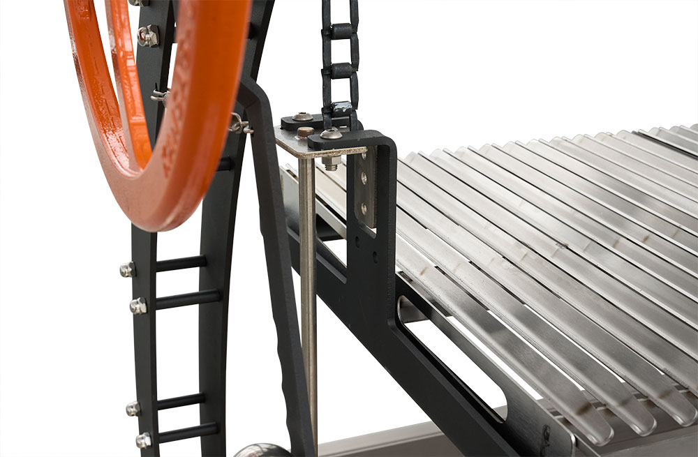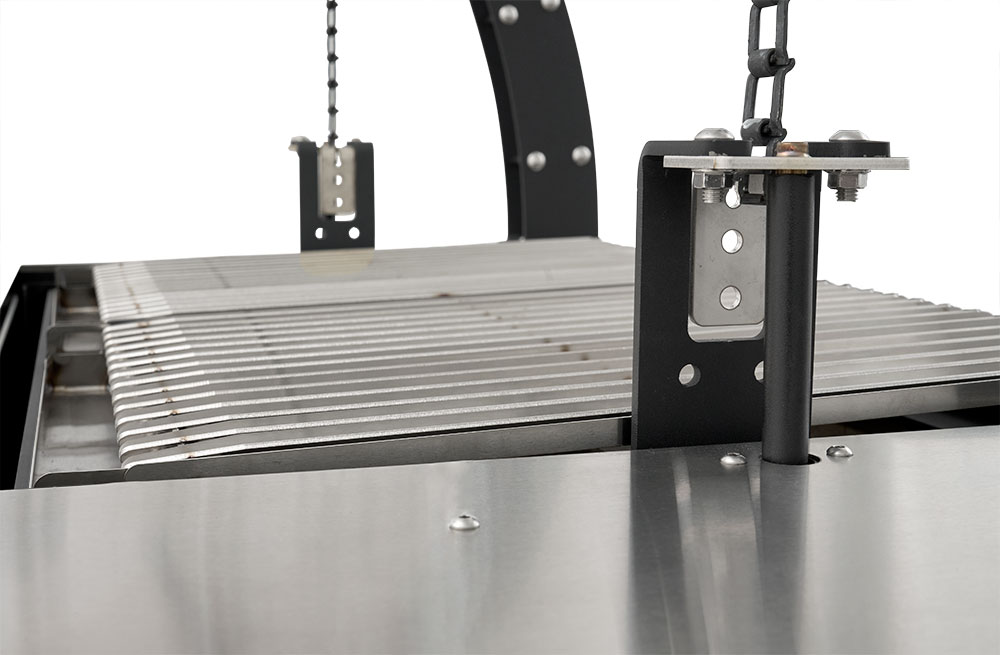 - 12-gauge stainless steel V-channel grates direct grease and drippings away from the flame and are height adjustable via the heavy-duty chain drive with 15” of variable travel. This allows for precise temperature control and consistent results.