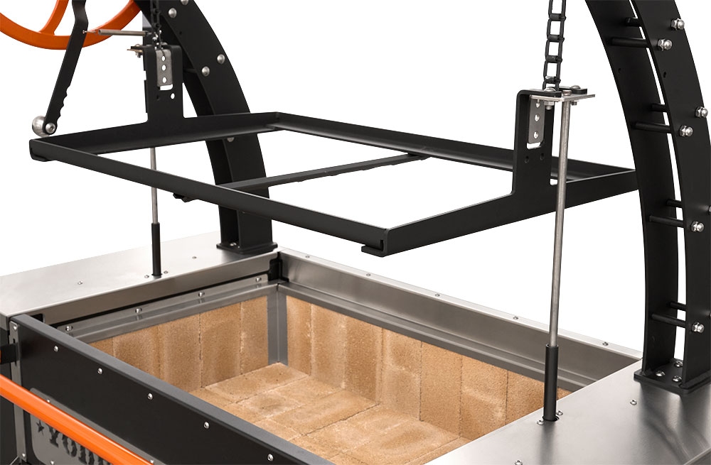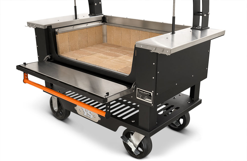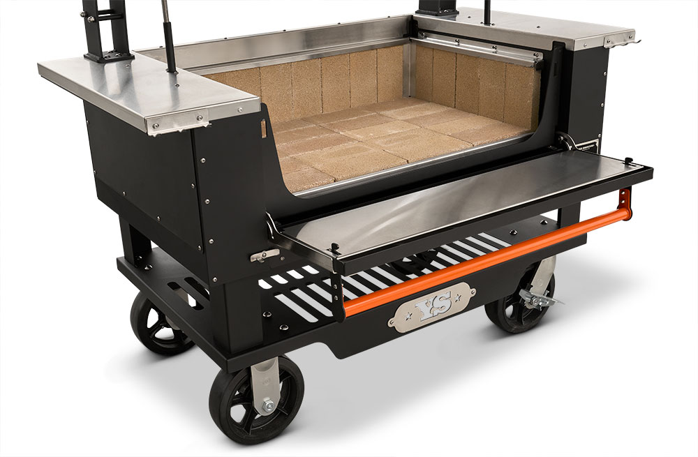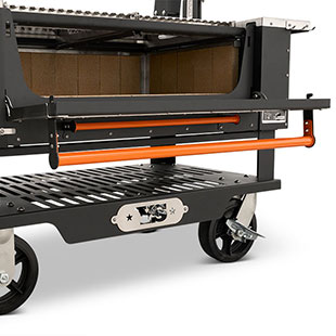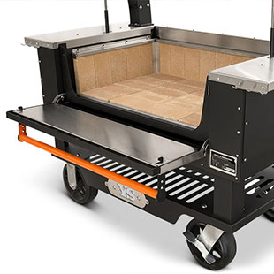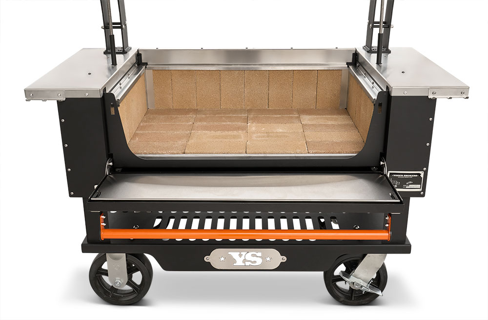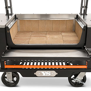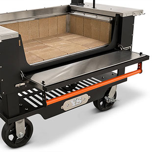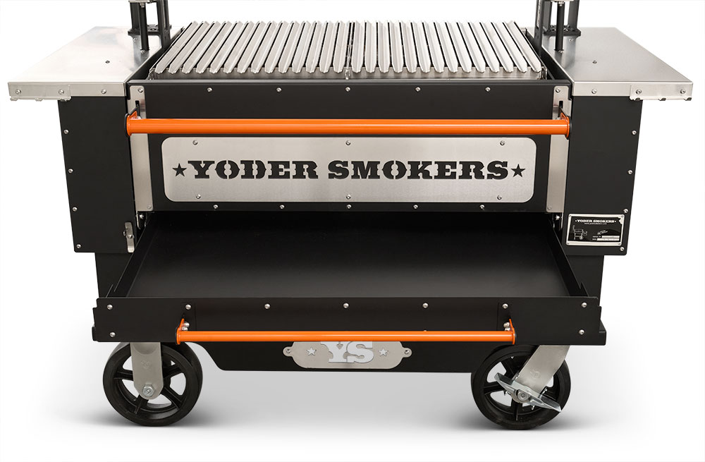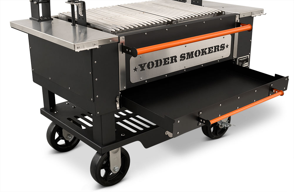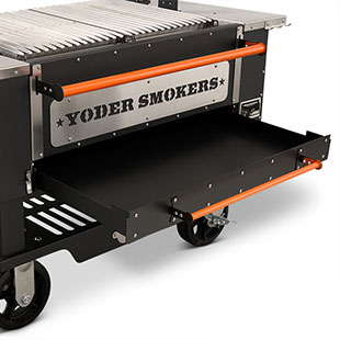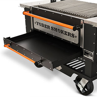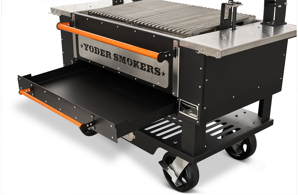 - Multiple access points at the front of the grill make keeping up on ash and grease is no problem with drawers that glide open for effortless cleanout. When it comes to fire management, an insulated drop-down front door allows for no-hassle, direct access to the fire when you need to add more splits or charcoal.