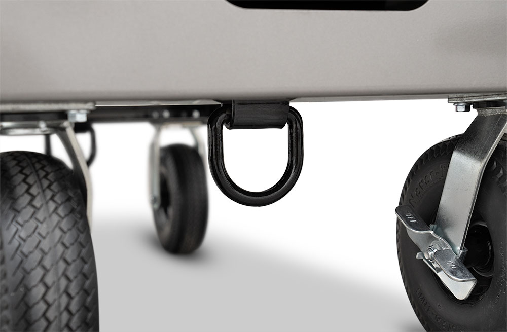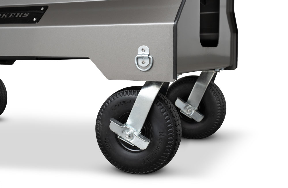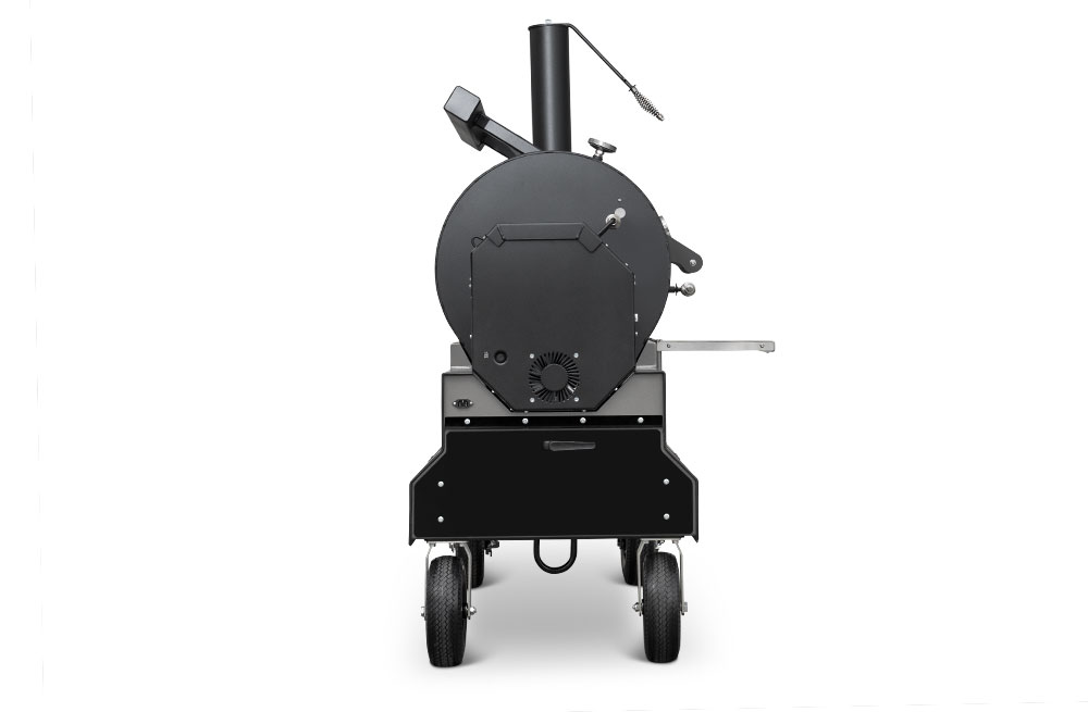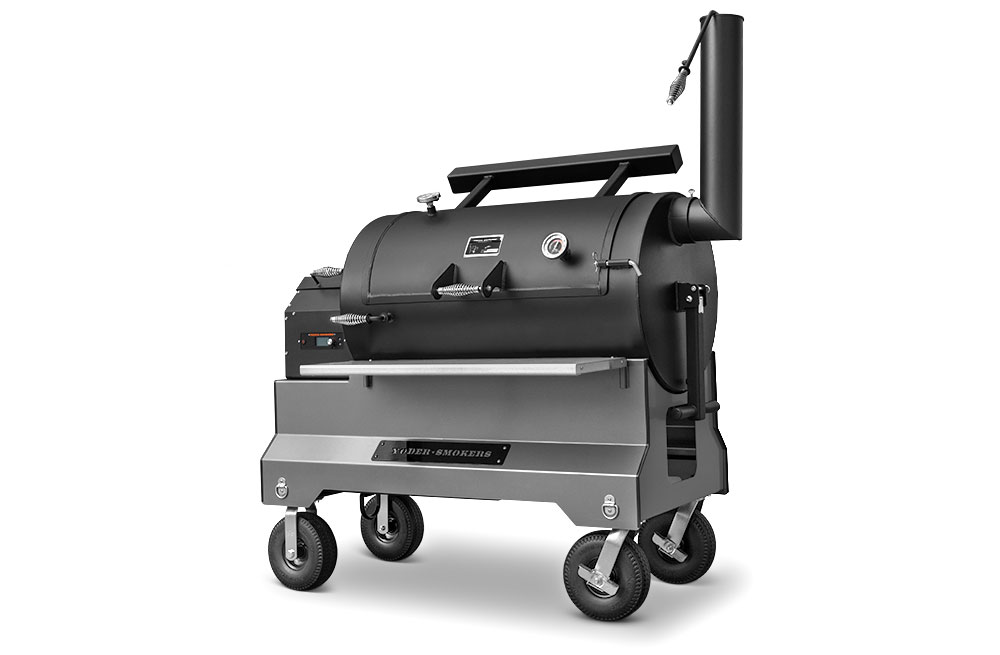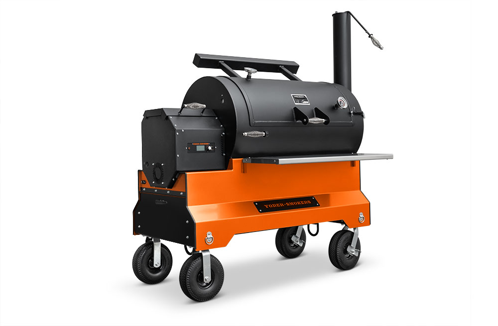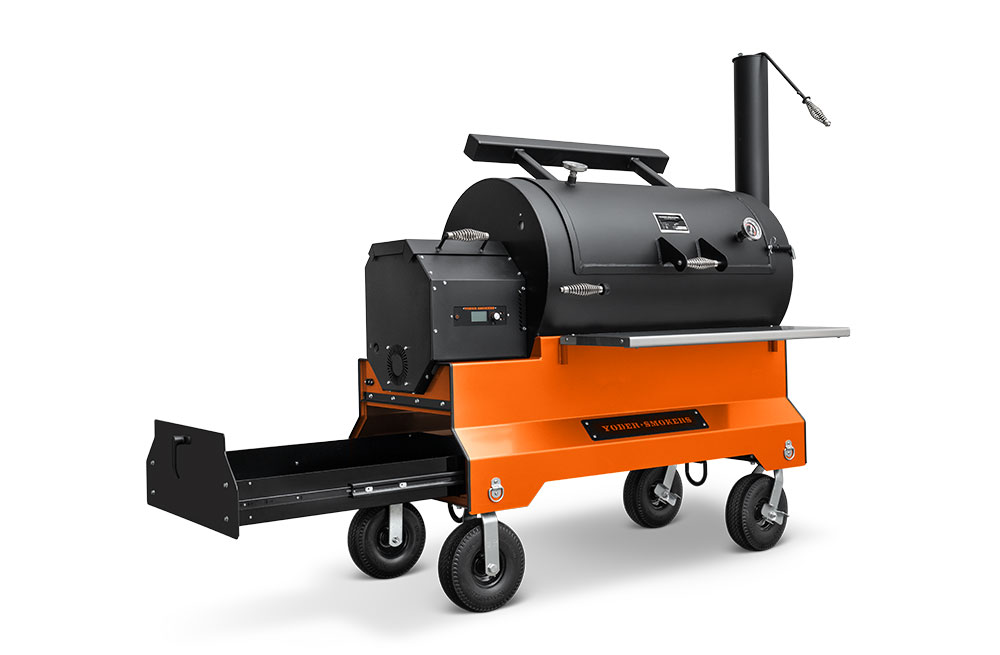 The YS1500S is mounted on our signature Yoder Smokers competition cart equipped with 10″ flat-free casters and an ergonomic folding pull-handle for effortless mobility in the backyard or from your trailer to your event’s cooking position. And when transported on a trailer, integrated tie-downs are accessible underneath the cart in order to securely stow the cooker. The YS1500S competition cart is constructed from heavy-duty 10-gauge steel and fully powder coated in your choice of orange, black, or silver.