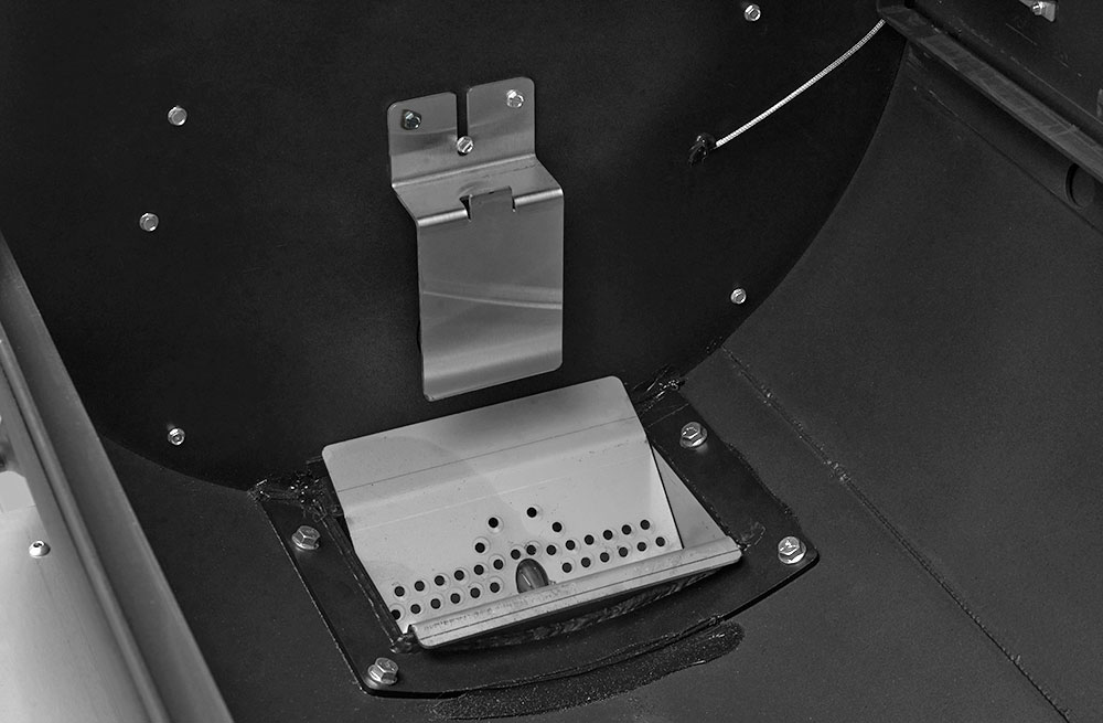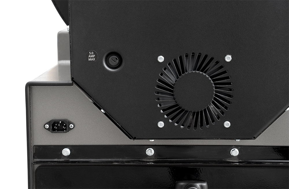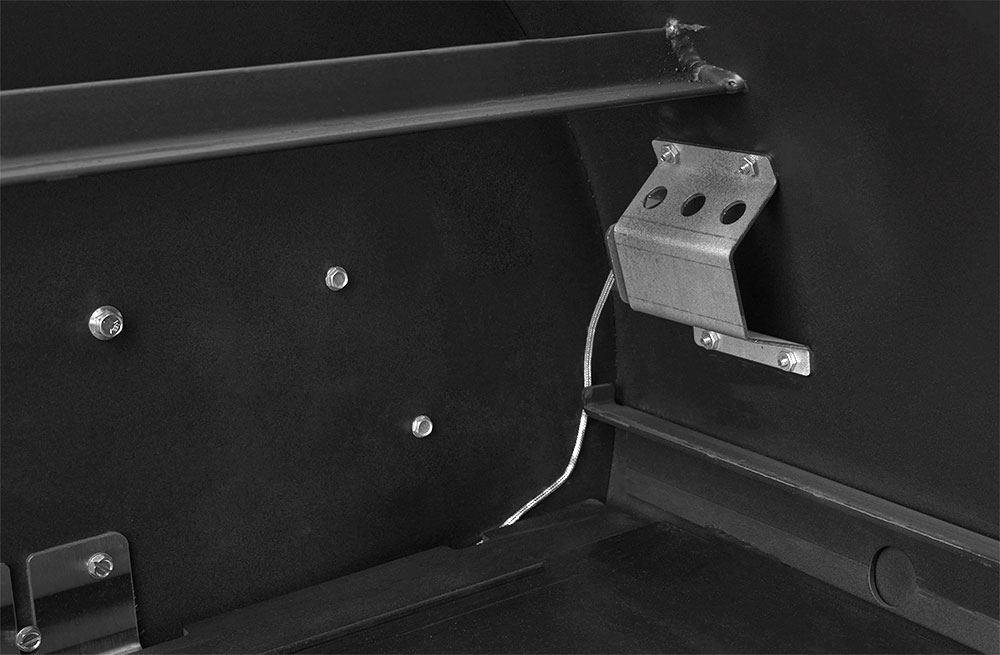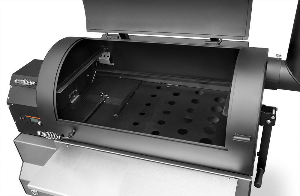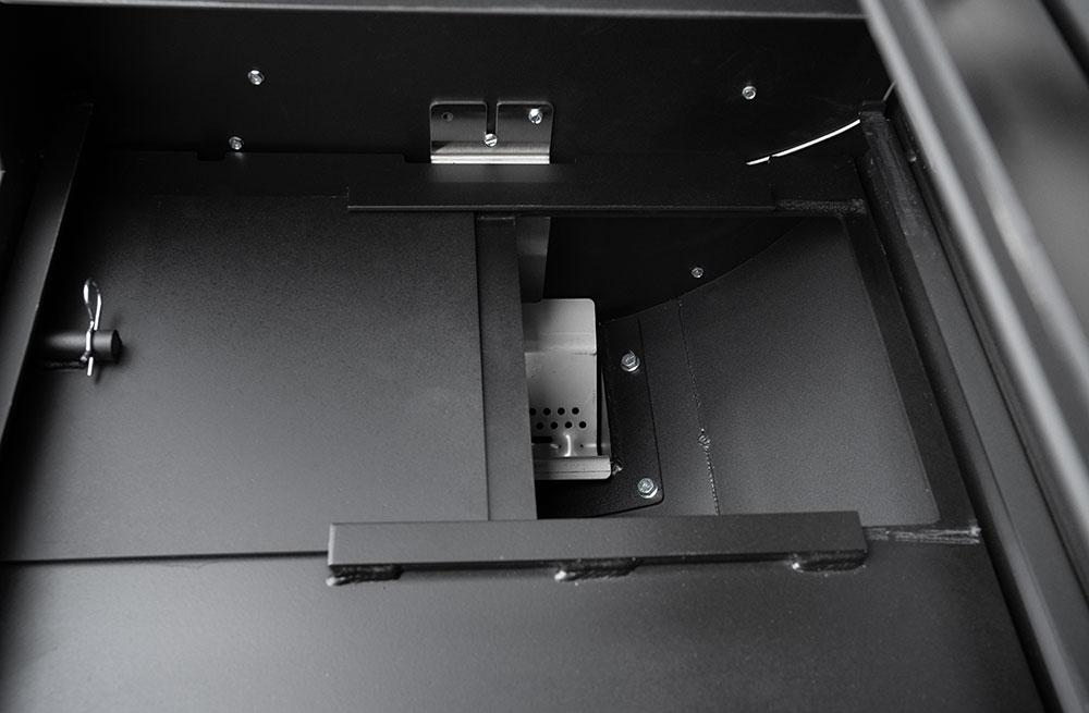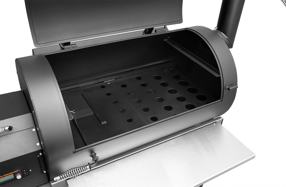 The YS1500S features a patented, two-piece heat management system (HMS) that creates and maintains distinct temperature zones, utilizing a perforated plate design. The left side of the HMS plate has a horizontal damper that slides open to introduce additional heat and direct-flame exposure. As the damper’s position is adjusted, the pitmaster can achieve a very precise and balanced temperature across the entire chamber. This balance of heat is moderated by the unique design of the plate on the right side, which features a series of progressively larger holes designed to disperse heat and smoke evenly. For example, with a 300° set temperature and the damper halfway open, the pitmaster can smoke a brisket at 250° on the far lower right grate while smoking chicken at 300° on the second level grates above the damper door. In turn, for dedicated hot zones or for intense grilling, the damper can be fully opened for direct access to the flames.